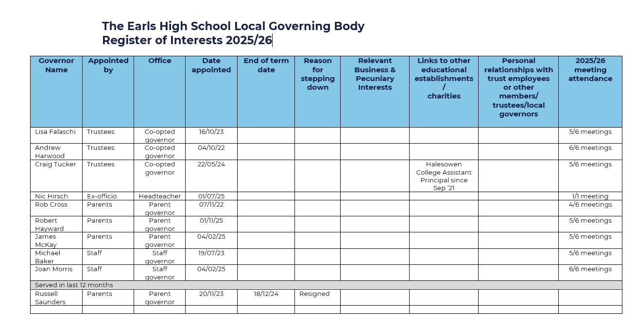 The Earls High School LGB is made up of nine members comprising of parent governors, community governors and staff governors.