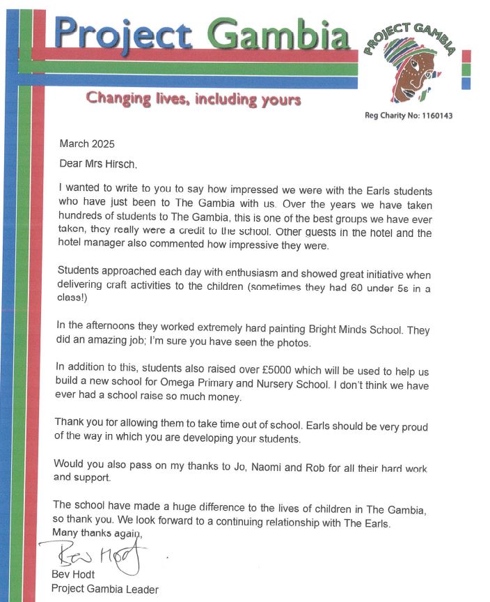 We are very proud that he raised an Early Day Motion in the House of Commons to highlight our longstanding support for Project Gambia. Bev Hodt, the founder of the Project Gambia charity, has also written to us to praise the fantastic commitment and compassion shown by our students. It is wonderful that this has been recognised so widely.